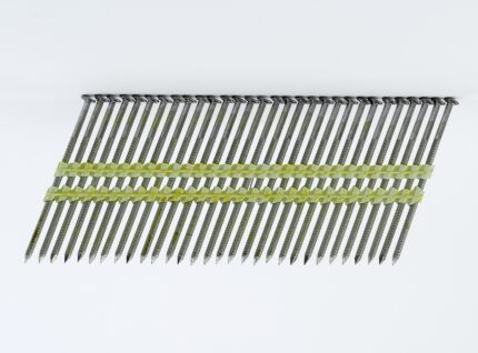 Klince typ R20° v páse spájané plastom. Použitie pre montáže drevostavieb, latkovanie, výrobu prefabrikovaných stien a stropných dielov, drevených plotov, debien, paliet, konštrukcií.